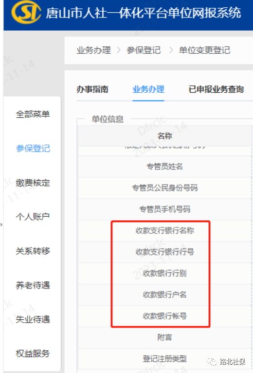 請?jiān)?/span>“參保登記”-“單位變更登記”模塊進(jìn)行信息維護(hù)修改。單位對照稅務(wù)登記的統(tǒng)一機(jī)構(gòu)信用代碼核實(shí)是否與社保登記的一致。單位對照稅務(wù)三方協(xié)議維護(hù)好社保系統(tǒng)中的銀行賬戶信息。銀行賬戶信息為以下五項(xiàng)(收款支行銀行名稱、行號、行別、戶名、賬號)要求全部輸入準(zhǔn)確,不含空格等非法字符。附件上傳營業(yè)執(zhí)照及三方協(xié)議即可。